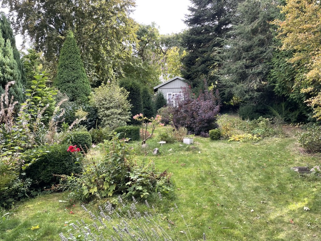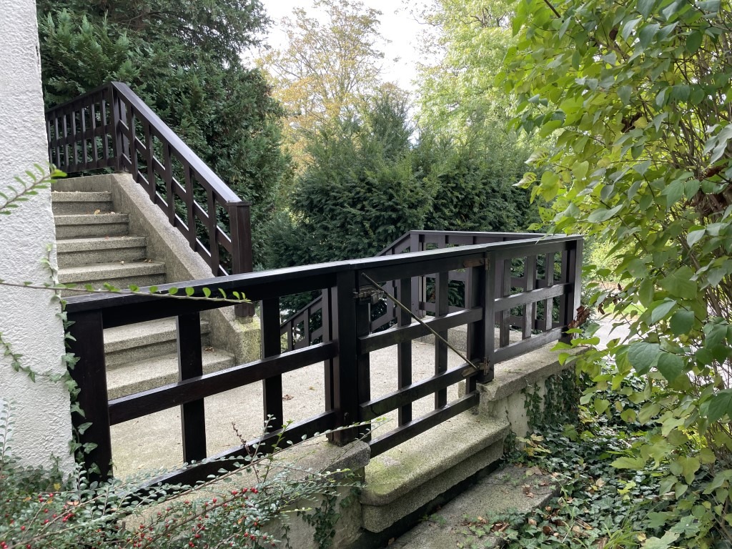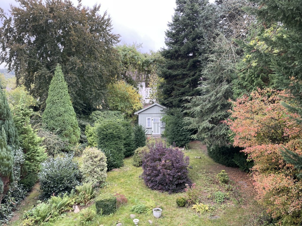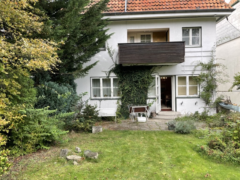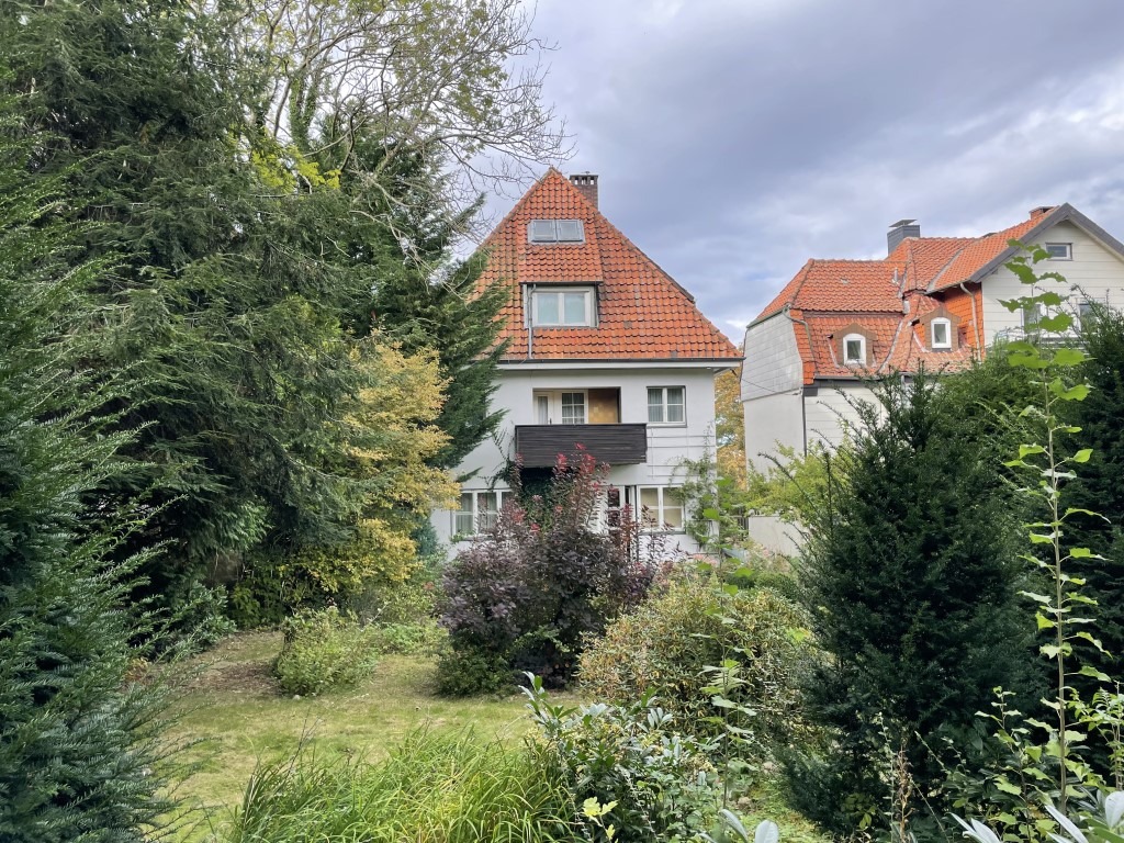 Die Villa erhebt sich auf einem 854 m² großen Eigentumsgrundstück einige Meter über dem Gehweg und bietet damit bereits vom Eingangsbereich einen phantastischen Ausblick auf die Stadt. Der langjährig gepflegte und wunderschön gestaltete Garten in leichter Hanglage erstreckt sich hinter dem Haus in südlicher Ausrichtung und ist abwechslungsreich angelegt mit zahlreichen Büschen, Stauden und altem Baumbestand. Am oberen Ende des Grundstücks befindet sich ein hübsches Gartenhaus, das ebenfalls eine schöne Sichtachse auf das Wohnhaus freigibt.
