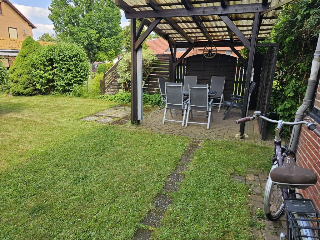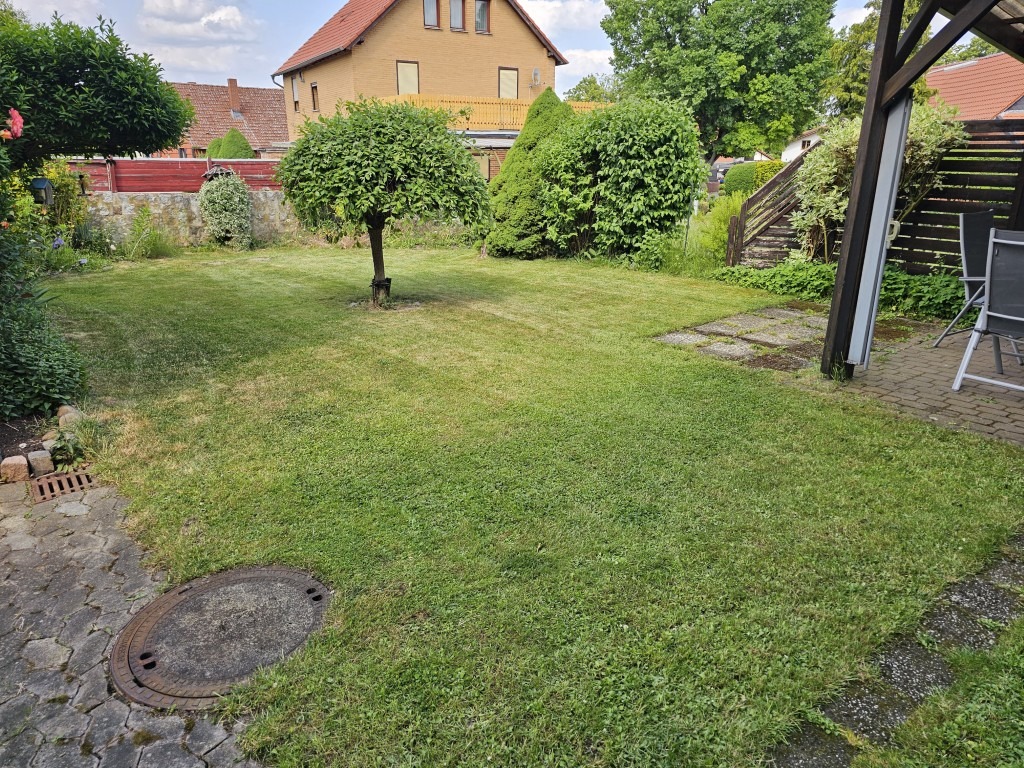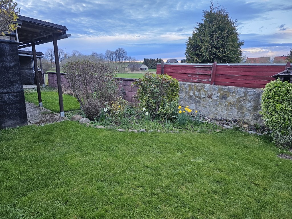 Das ebene, rechteckig geschnittene Eigentumsgrundstück (450 m²) ist abwechslungsreich gestaltet und bietet für PKW eine befestigte Zufahrt seitlich des Hauses, die auf den gepflasterten Hof zwischen Wohnhaus und Nebengebäude führt. Eine von Pflanzen eingerahmte Rasenfreifläche wird ergänzt durch einen gemütlichen, überdachten Freisitz. Ein weiterer „Erholungsort“ mit einer schönen, freien Aussicht findet sich hinter dem ehemaligen Stallgebäude.