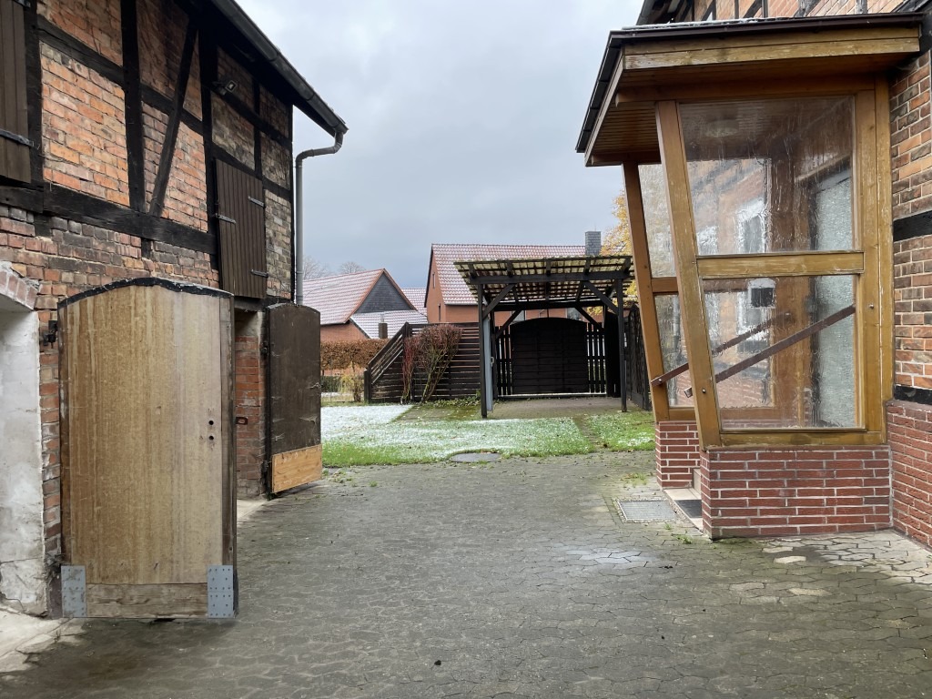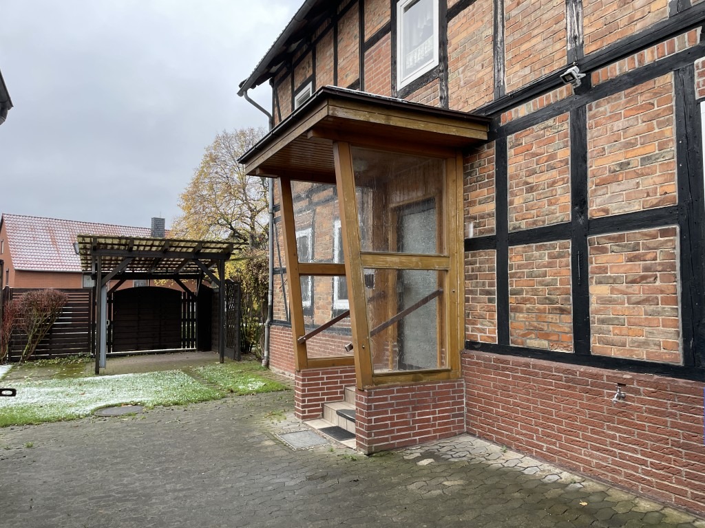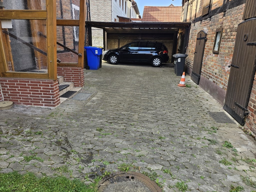 Auf dem rückseitigen Hof und in der Zufahrt finden auf gepflasterten Untergrund 1- maximal 4 Fahrzeuge Platz. Ein Carport (einfache Bauweise) steht ebenfalls zur Verfügung. Alternativ finden sich an der Straße vor dem Haus weitere Stellplätze.