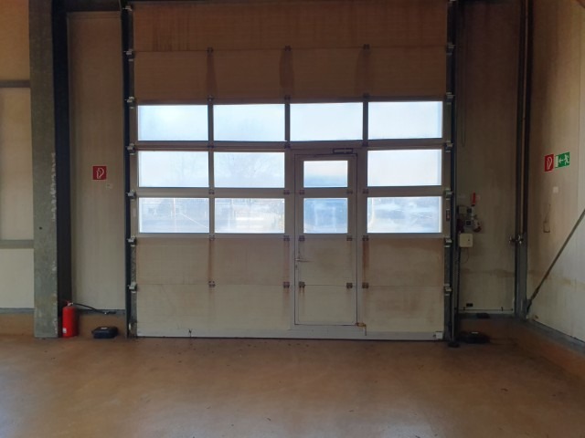 Große Halle mit elektrischem Rolltor (ca. 4 Meter Durchfahrthöhe und -breite) – Starkstrom, Bodenablauf sowie Fettabscheider vorhanden – mit Blockheizkraftwerk & Wärmepumpe beheizbar – flexibel teil- oder erweiterbar auf bis zu 1.200 m² – Durchfahrt und Hof zur bequemen Anlieferung gut nutzbar